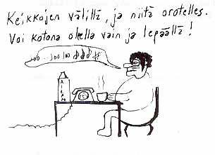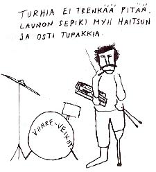 Armaski turhaa pitää puhelintavieres, koska ei sieltä kukaa soita. ja vaikka soittaaski, ei Armas sitä kuulisi. Armas ku kaivoo rumpukapulalla kerran korvaa- kapula katkes korvahan ja alakoo kasvaa pajua Sej`jäläkehen on Armaksella ollu vähä huono kuulo. | |||||||||||